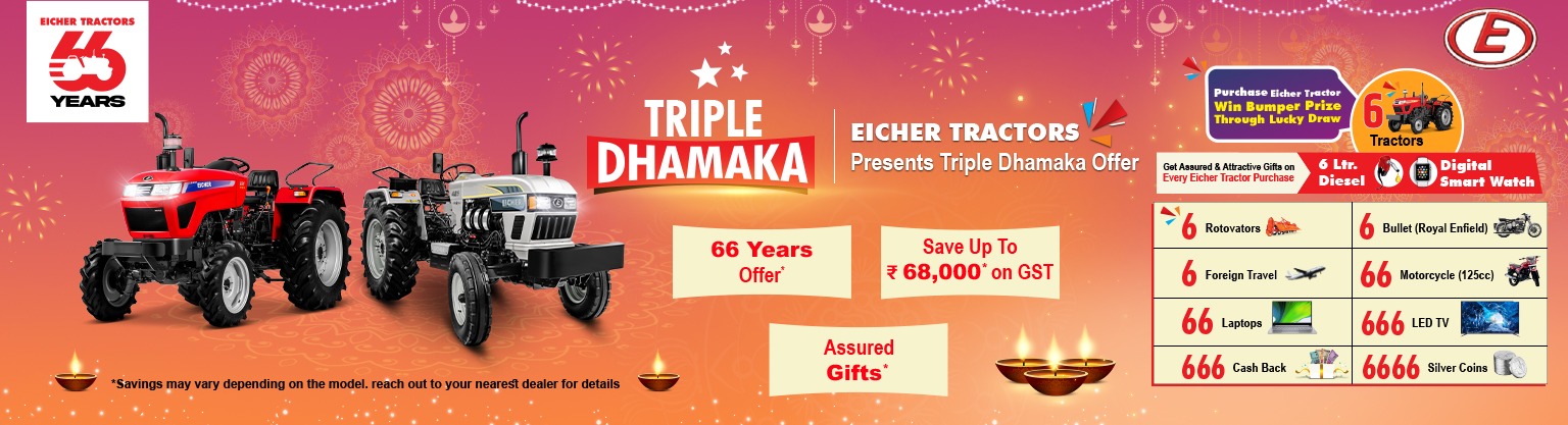 Do not miss out on the best chance in the year to upgrade your tractor or buy new tractors from Eicher Tractors. Festivals are all about making new beginnings. With 66 years of trust behind it, Eicher Tractors Triple Dhamaka Offer combines affordability, reliability, and celebration in one package. With this, Eicher Tractors not only offers the lowest-priced tractor in India, but also the best possible machine to enhance the overall farming experience.