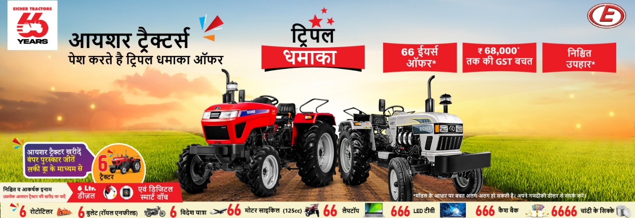 66 से ज़्यादा वर्षों से, आयशर ट्रैक्टर्स किसानों के साथ कंधे से कंधा मिलाकर खड़ा है और ऐसे ट्रैक्टर पेश कर रहा है जो मज़बूती, सरलता और बचत का एक साथ लाभ देते हैं। GST में हुए हालिया बदलावों के साथ, आधुनिक ट्रैक्टर खरीदने का सपना पहले से कहीं ज़्यादा किफ़ायती हो गया है।