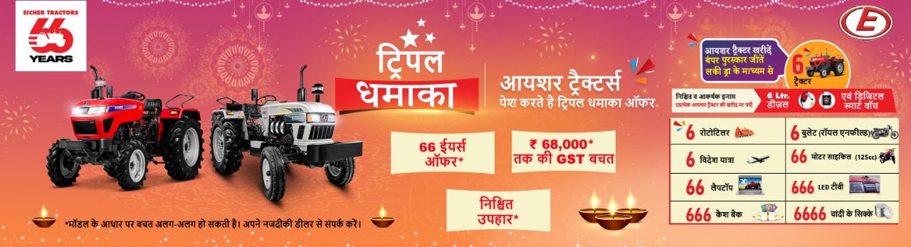 अपने ट्रैक्टर को अपग्रेड करने या आयशर ट्रैक्टर्स से नए ट्रैक्टर खरीदने का साल का सबसे अच्छा मौका हाथ से न जाने दें। त्योहार नई शुरुआत करने का प्रतीक होते हैं। 66 सालों के विश्वास के साथ, आयशर ट्रैक्टर्स ट्रिपल धमाका ऑफर किफ़ायतीपन, विश्वसनीयता और उत्सव को एक ही पैकेज में समेटे हुए है। इसके साथ, आयशर ट्रैक्टर्स खेती के समग्र अनुभव को बेहतर बनाने के लिए सर्वोत्तम संभव मशीन भी प्रदान करता है।